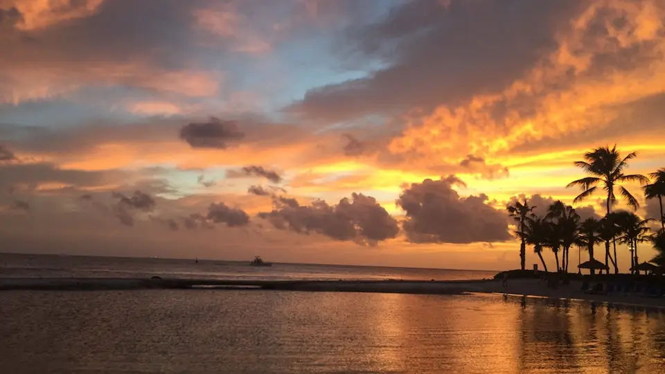 Sunsets at Baby Beach feel wider and slower than elsewhere on the island. The sun drops directly toward the horizon, unobstructed by high-rise buildings.